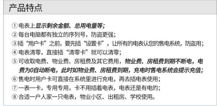主要特點(diǎn):應(yīng)用計(jì)算機(jī)管理,先購(gòu)電后用電;在額定電流范圍內(nèi)能限制使用功率(由供電部門限定);一表一卡,專卡專用,失卡不失電,補(bǔ)卡再用;電卡能雙向傳遞數(shù)據(jù),能自動(dòng)斷電告警用戶購(gòu)電;電量為零時(shí),自動(dòng)拉閘斷電;并具有一定的防竊電軟件設(shè)計(jì)等。