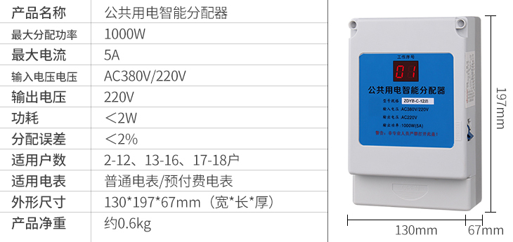 一、智盛牌公共用電智能分配器,是將公共樓道用電所消耗的電能(如樓道燈,對講防盜門等),自動分配到各受益用戶的電表中。每天輪流接通一戶電表,開機通電時第一戶電表隨機產生,達到公平分攤電費的目的,本款公共用電智能分配器的特點:外置保險絲更換方便,可實時顯示均分到哪戶。
